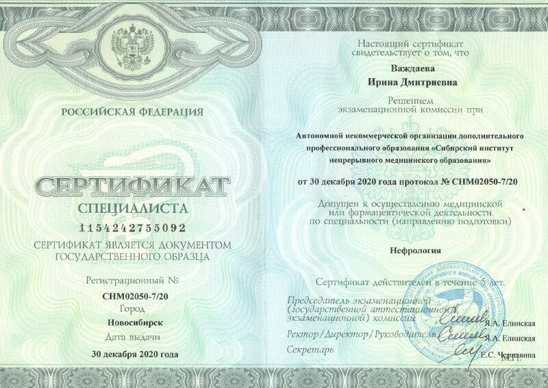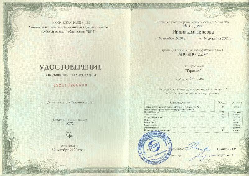 Повышение квалификации: "Нефрология", Сибирский институт непрерывного медицинского образования "Остеопатия", Лидер Специалистов (2019 г.) "Терапия", Образовательный ЦЕНТР ДДМ (2020 г.)