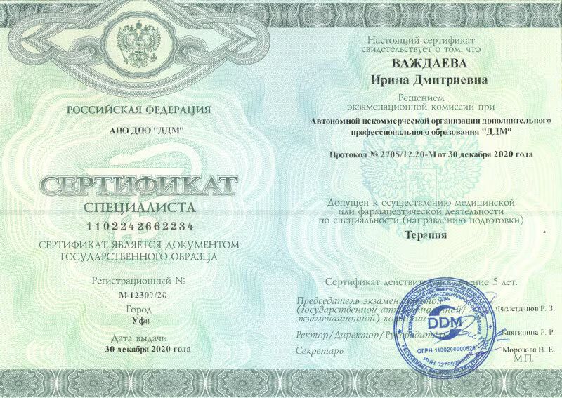 Ирина Дмитриевна Важдаева остеопат, терапевт, нефролог. Медицинский стаж более 20 лет.