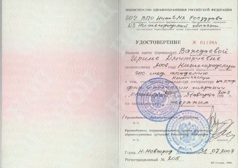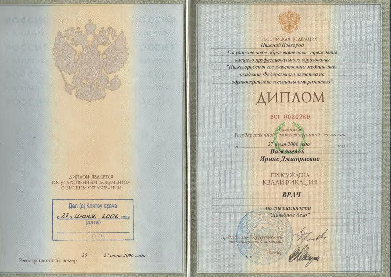 Образование: Диплом по специальности "Лечебное дело", Нижегородская государственная медицинская академия Федерального агентства по здравоохранению и социальному развитию (2006 г.)